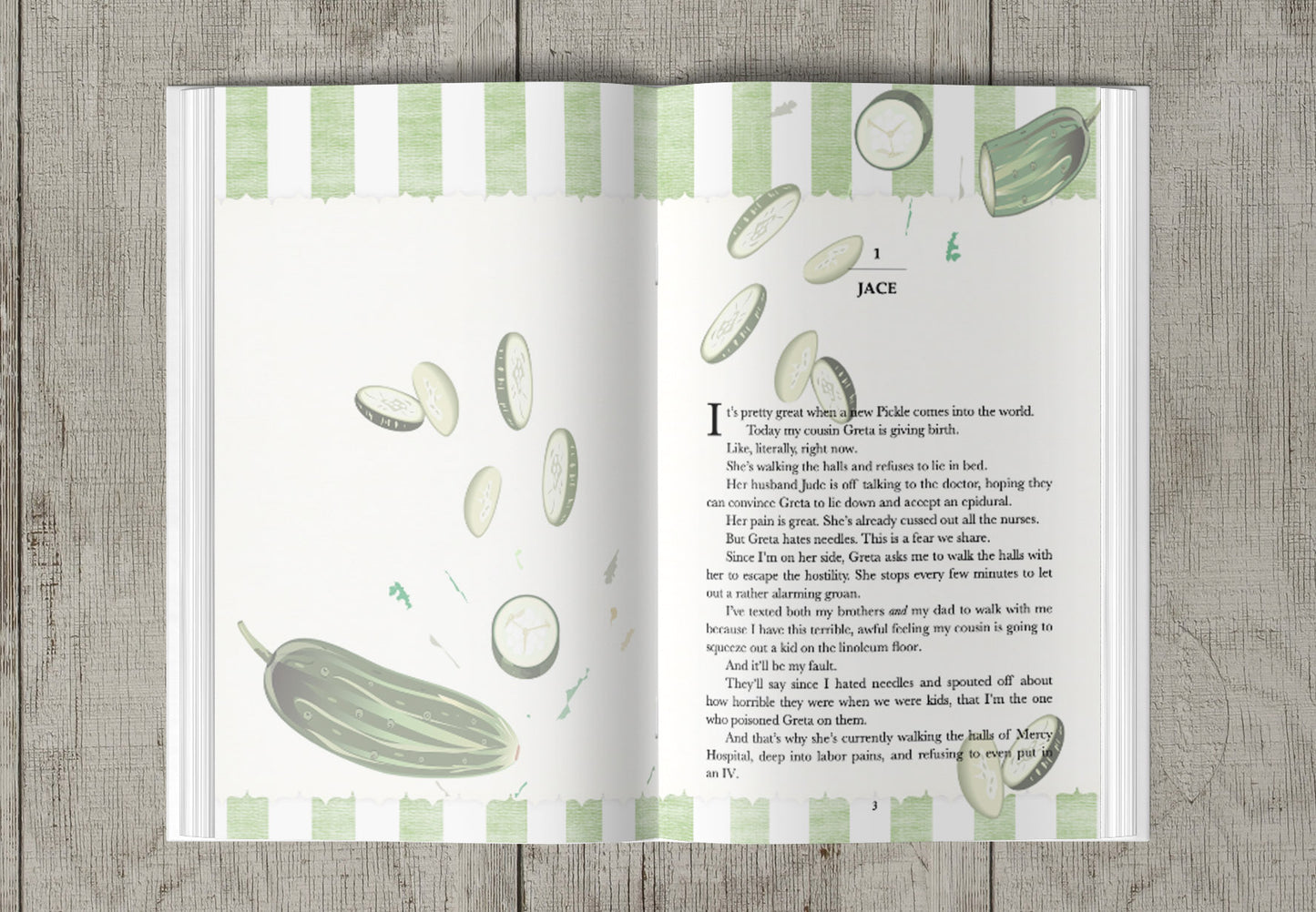 - Full-color printed end pages with art from the character cover, plus cute pickles!