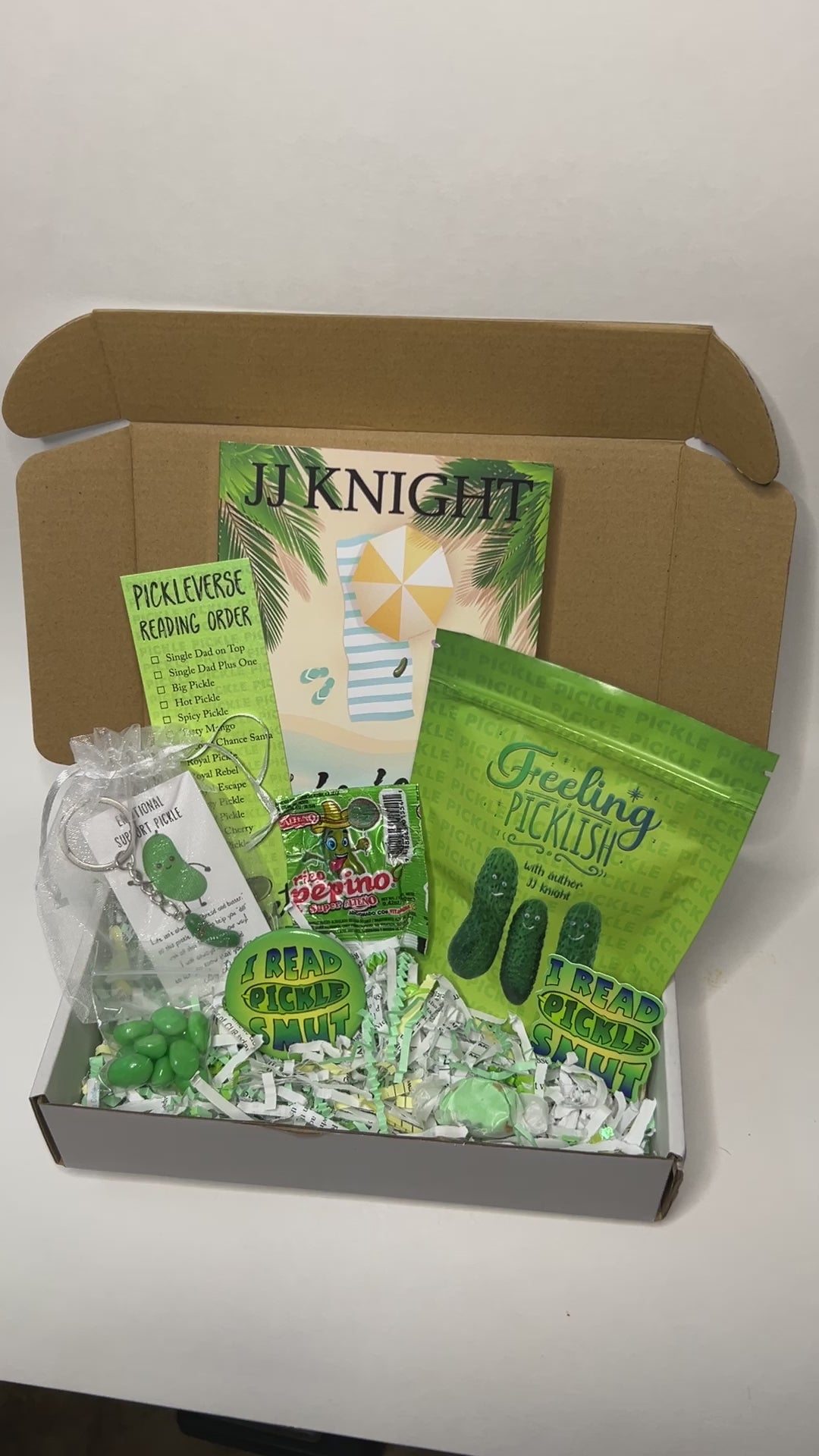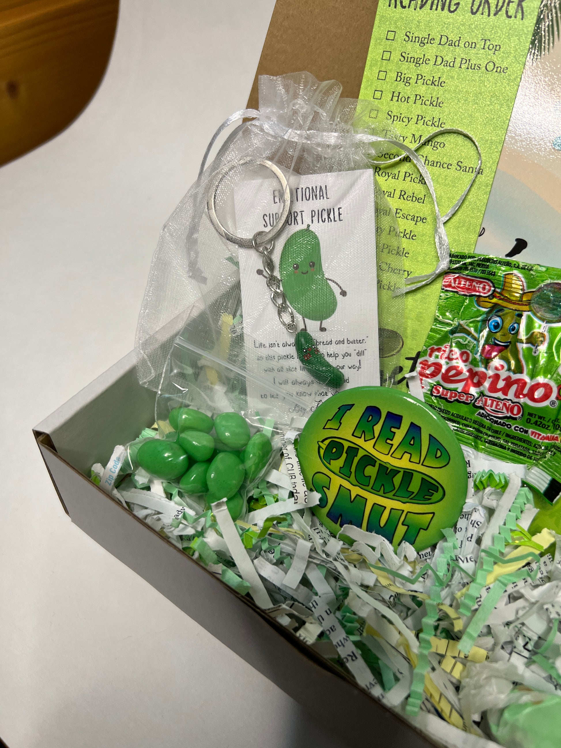 - A pickle pouch that includes a "I read pickle smut" button and sticker, an adorable pickle keychain, and three types of pickle-flavored candy