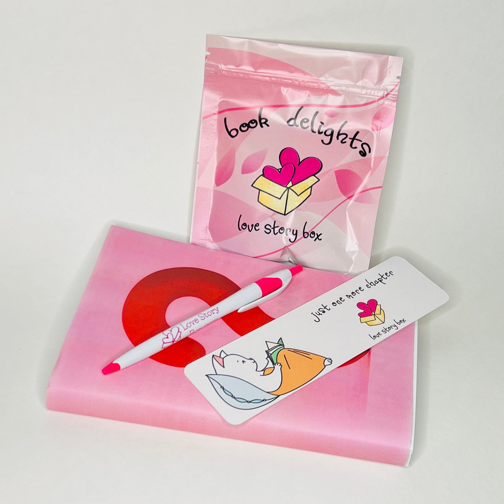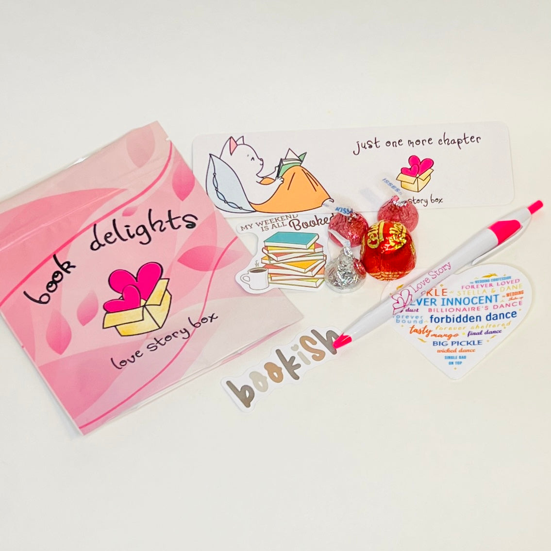 - All books come with the love story pen, reader stickers, a "just one more chapter" bookmark, and chocolate.