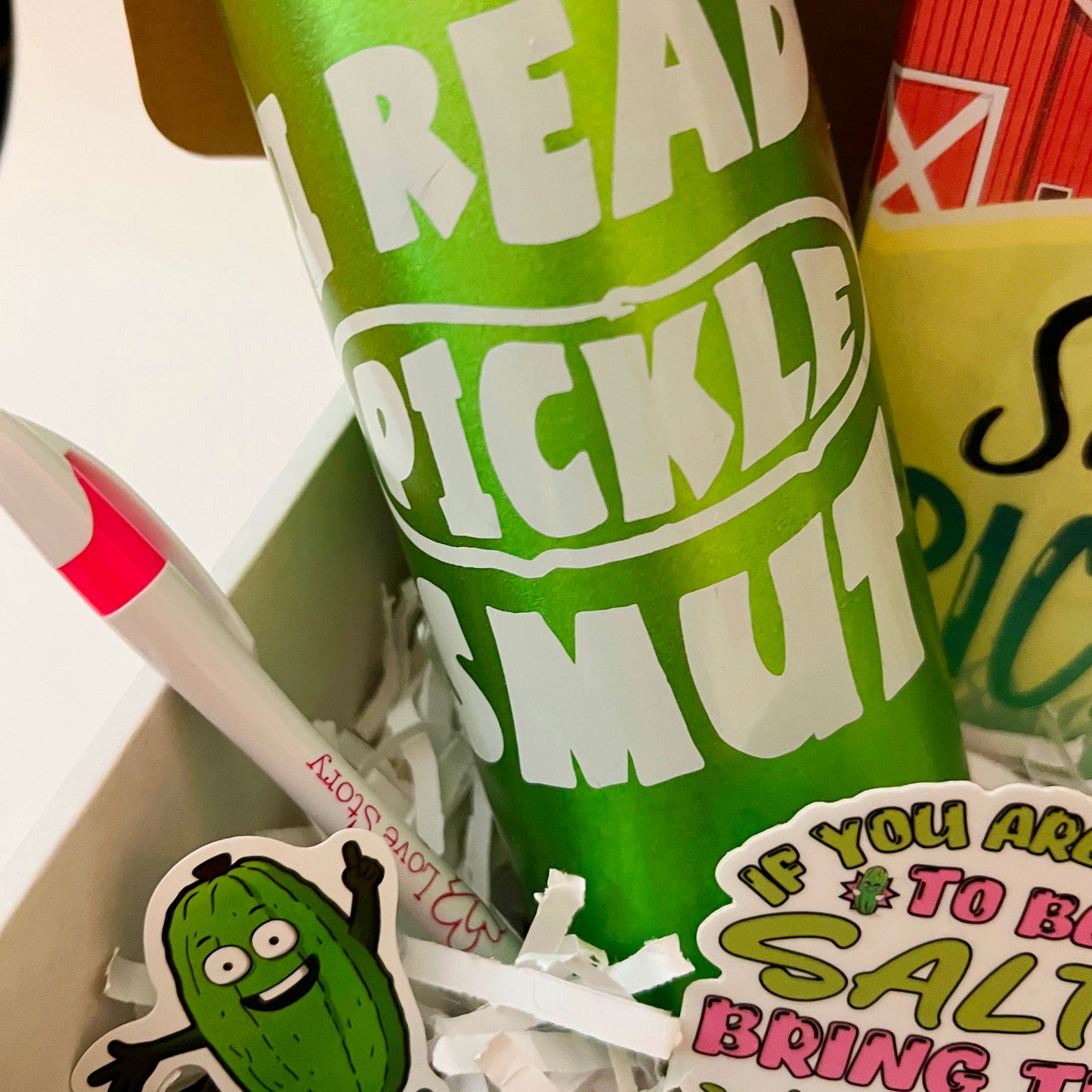 This book box includes the signed paperback, a hilarious "I read pickle smut" aluminum water bottle with a flip & sip cap, a matching bookmark, and both pickle and goat stickers.